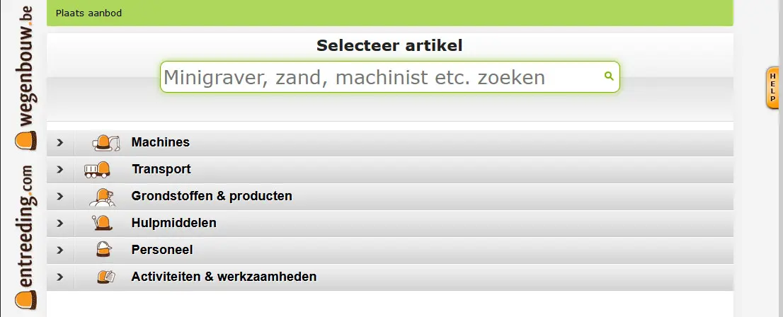 1) Nieuw aanbod toevoegen via het zoekveld (typ aantal letters en het systeem geeft je aantal mogelijke opties) of via nieuw artikel/aanbod toevoegen, waarna je selecteert uit de structuur / categorie (machines - transport - grondstoffen - hulpmiddelen - personeel - werkzaamheden). Klik verder om de verschillende categorieën te openen, en selecteer de juiste machine, grondstof, activiteit, ... Vul vervolgens alles in zoals de conditie van het item 'te koop' - 'te huur met bediening' - 'te huur zonder bediening' - 'personeel', specificaties enz. en daarna opslaan. Het aanbod is dan toegevoegd in jouw lijst.