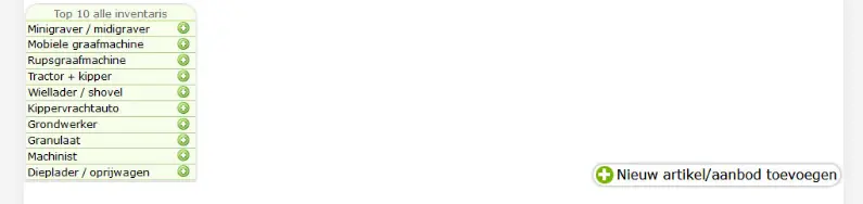 Groene plusjes: hiermee kan je kopiëren, als je bijvoorbeeld verschillende rupsgraafmachines wenst in te voeren in jouw aanbod.