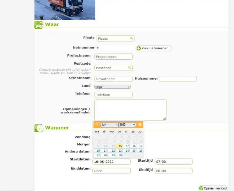 Aanbod plaatsen (licht groene menubalk)