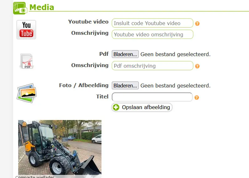 Schriftje met pen: hiermee kan je jouw machine, product, ... in detail gaan wijzigen. Na het aanmaken van aanbod kan je bij wijzigen vanaf dan ook media toevoegen zoals een pdf (bijvoorbeeld technisch verslag bij aanvulgrond of technische fiche van een machine) of film (youtube).