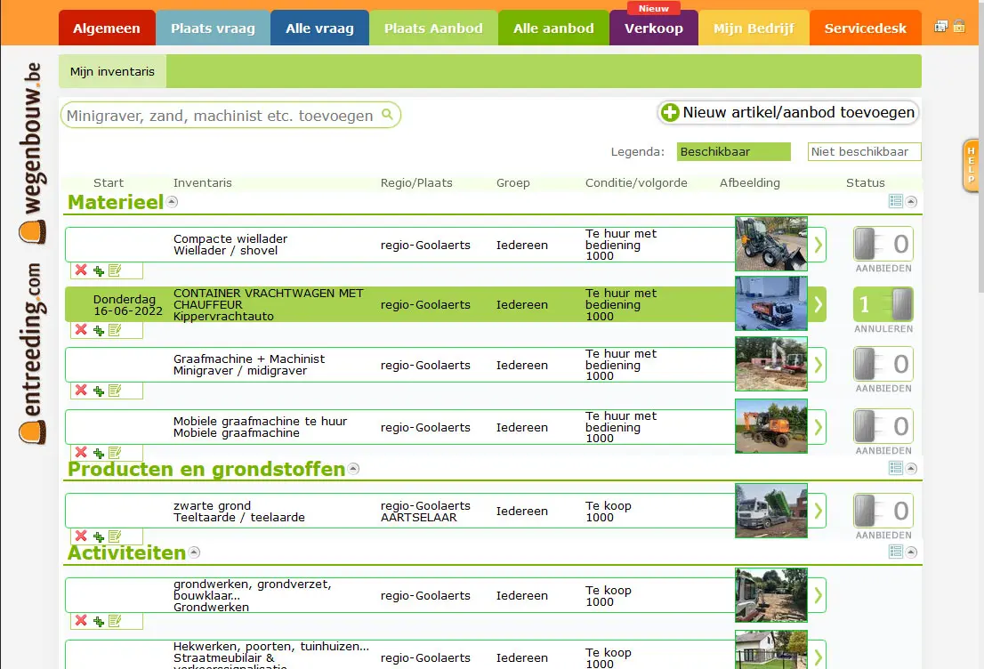 Beschikbaar stellen van aanbod (Witte status <> Groene status). Heb je een bepaalde machine of vrachtwagen met of zonder bediener vrij één van de komende werkdagen, of start je weldra een werf waar je teelaarde of andere grondstof gaat uitgraven, stel jouw aanbod dan 'beschikbaar' (groene status).