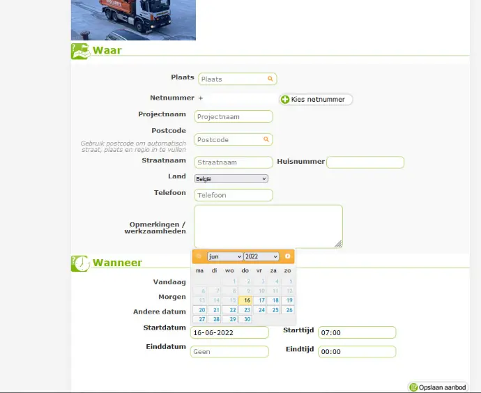 Bij het aanbieden, selecteert het systeem automatisch de eerstvolgende werkdag. Je kan deze wijzigen door op het knopje 'Schriftje met pen' (zie afbeelding hieronder).