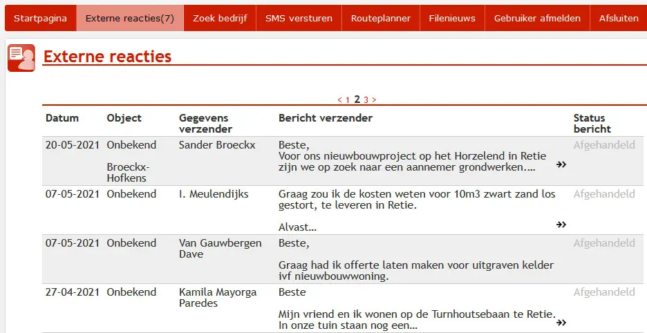Externe reacties zijn reacties van leden of (niet) leden -- specifiek aan u gericht -- op uw bedrijfsprofiel of inventaris die verstuurd zijn middels invulformulier via de websites (entreeding.com / wegenbouw.be), bedrijfspresentatie (niet-leden gedeelte) en middels invulformulier in deze applicatie.