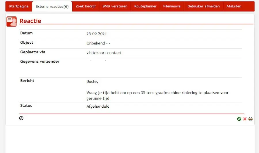 Als je een reactie opent kan je de status van de reactie wijzigen van 'open' naar 'afgehandeld', de reactie afdrukken (printer logo) of verwijderen (rood kruisje).