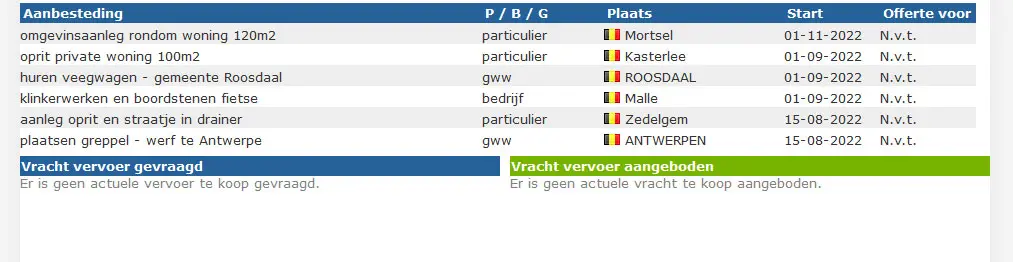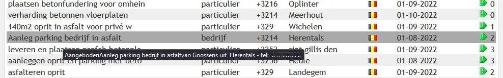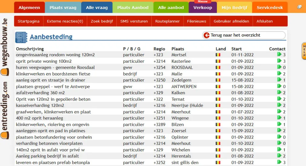 Daar waar groen pijltje staat, hebben minder dan 4 andere gebruikers van onze applicatie de contactgegevens van de aanvrager geraadpleegd. Je kan verder sorteren door op 'regio' - 'start' (=gewenste startdatum) - etc. te klikken. De aanvraag kan geplaatst zijn door een gww bedrijf (gww), bedrijf of organisatie/overheid (bedrijf) of particulier.