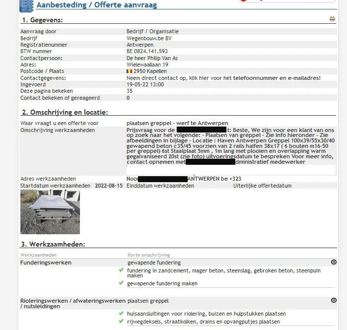 Daar verschijnt de detailpagina van deze aanbesteding. De aanvrager, omschrijving en locatie, en welke werkzaamheden en andere items die zijn inbegrepen in deze aanvraag.