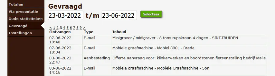 Hier zie je de lijst met de 'vragen' en 'aanbestedingen' die je per mail werden toegezonden ifv de instellingen bij 'contactpersonen'.