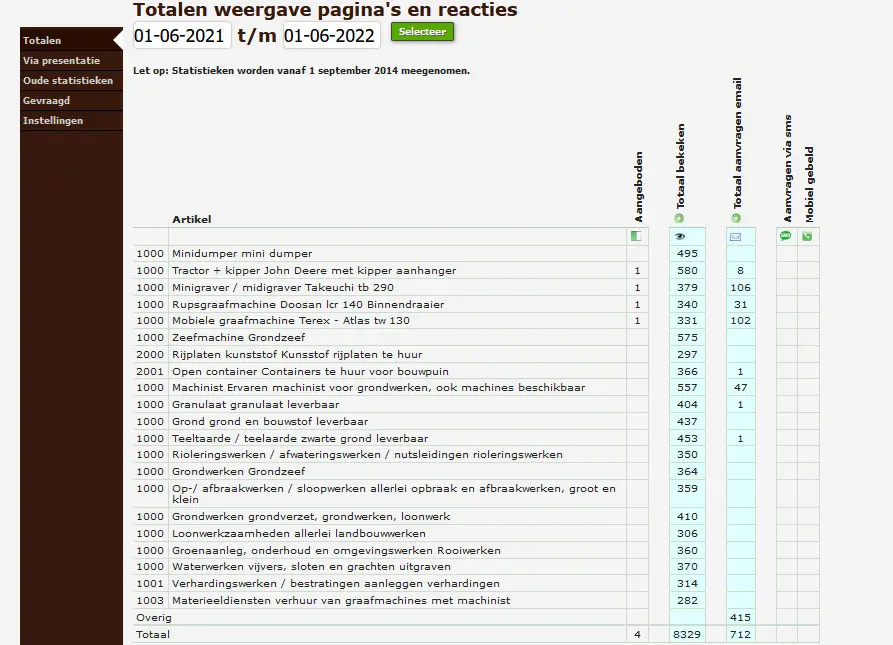 'Artikelen' : dit zijn de statistieken van je producten/machines/activiteiten die op de websites (wegenbouw.be / entreeding.com) getoond werden. Dus niet op jouw bedrijfspresentatie, maar bijvoorbeeld door een opzoeking bij machines of grondstoffen / producten op de websites.